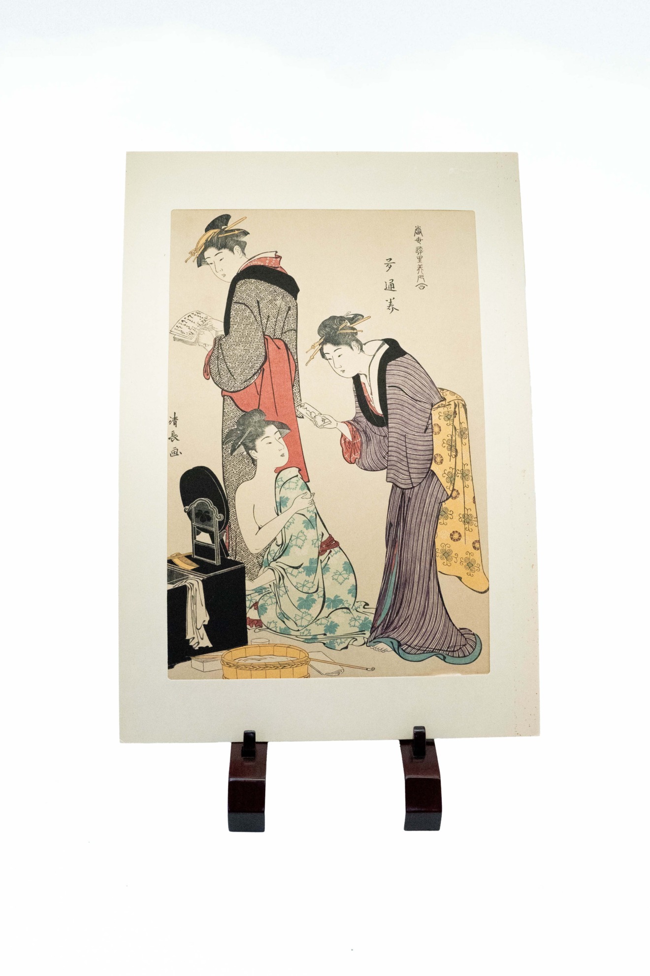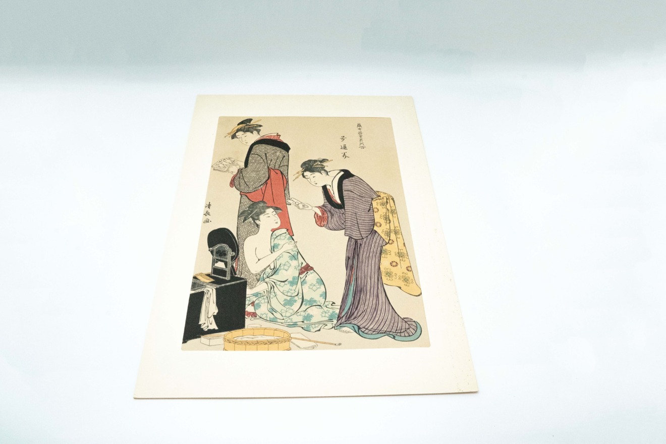 作者は鳥居清長。芸者さんの出勤前の身だしなみを整えているお部屋にお手紙が届いた、又は本日のスケジュール表なのか、もう一人の女性がお話ししている風景かと思われます。