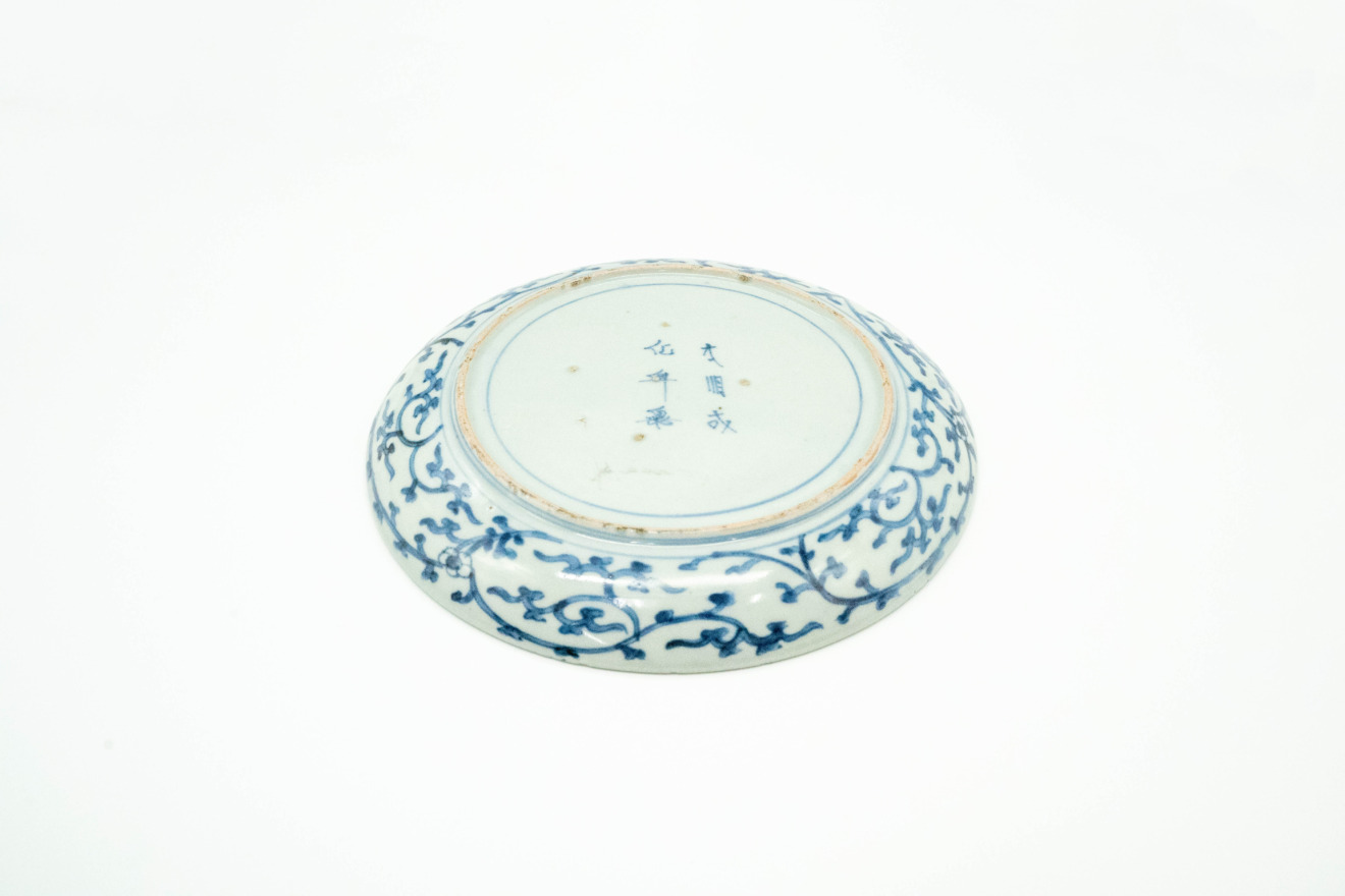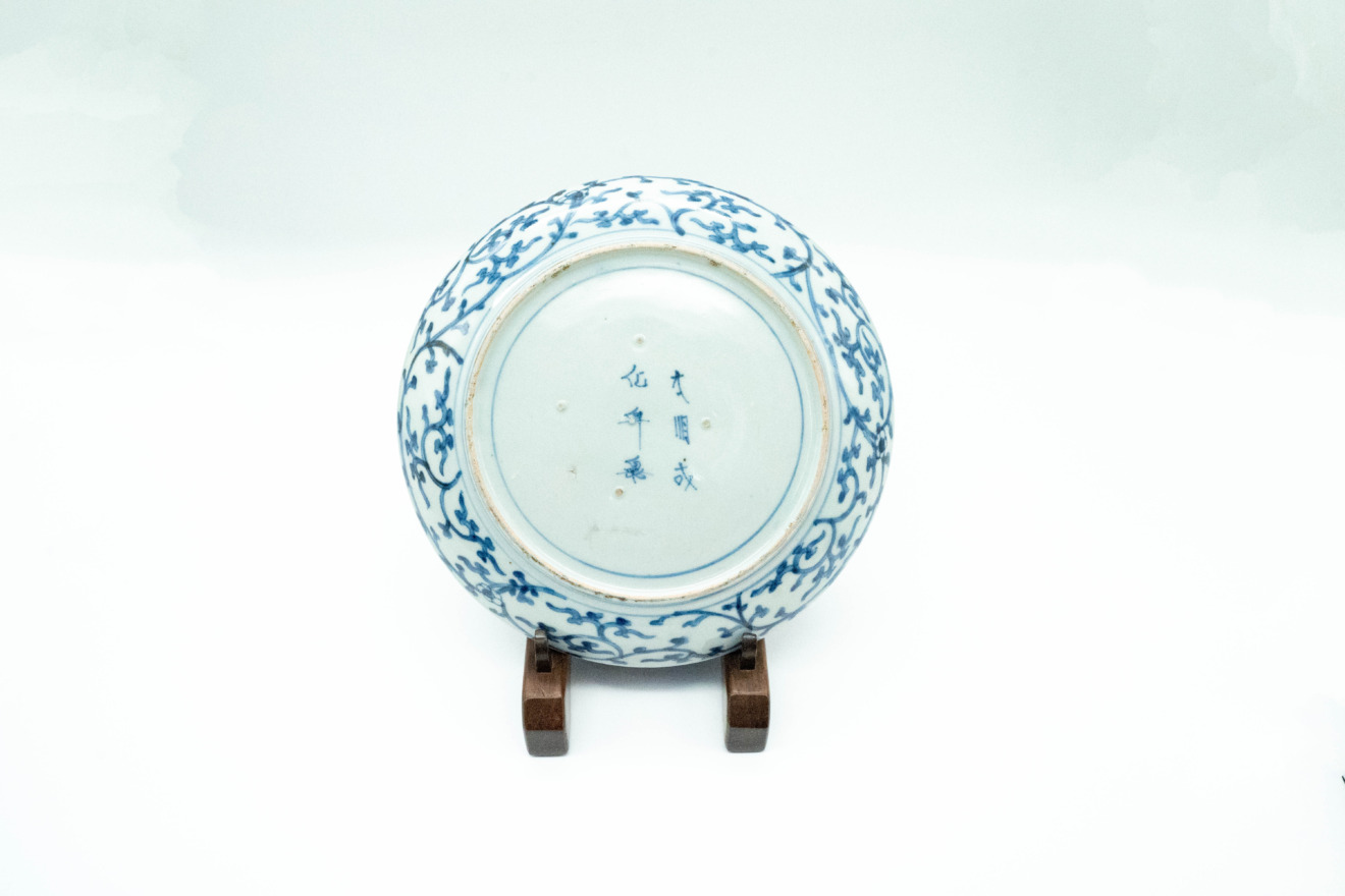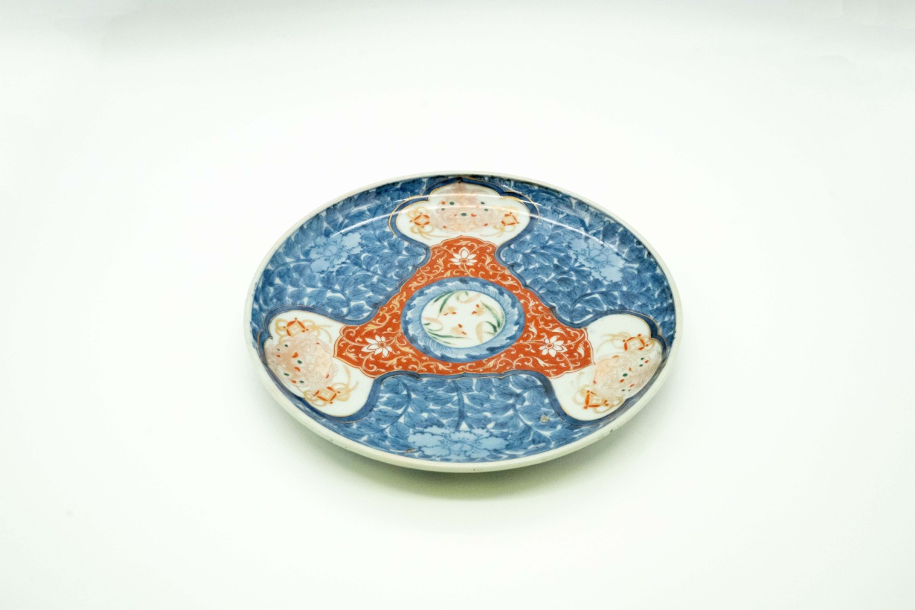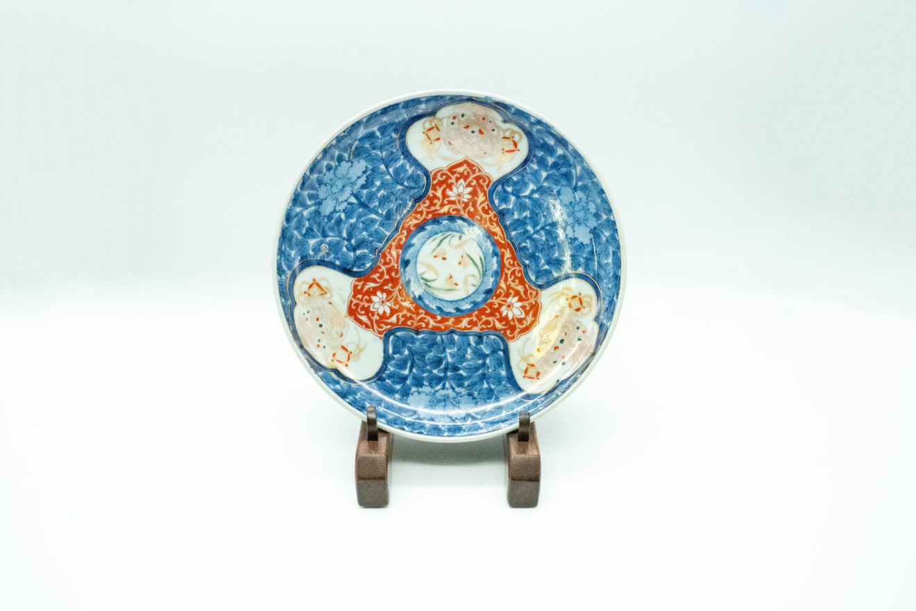 とても珍しい図柄をしており、三つの窓には獅子のような、龍のような絵付けがあります。また、三つの窓から伸びた三角形の中央には縁が描かれ、家紋を表現したような絵付けになっています。白地がほとんどなく、青と白の染付草花で埋め尽くされるという、しっかりとした図柄。裏面も蛸唐草紋が縁どられた丁寧な絵付け。飾り皿でもお使いになることもできるお皿です。