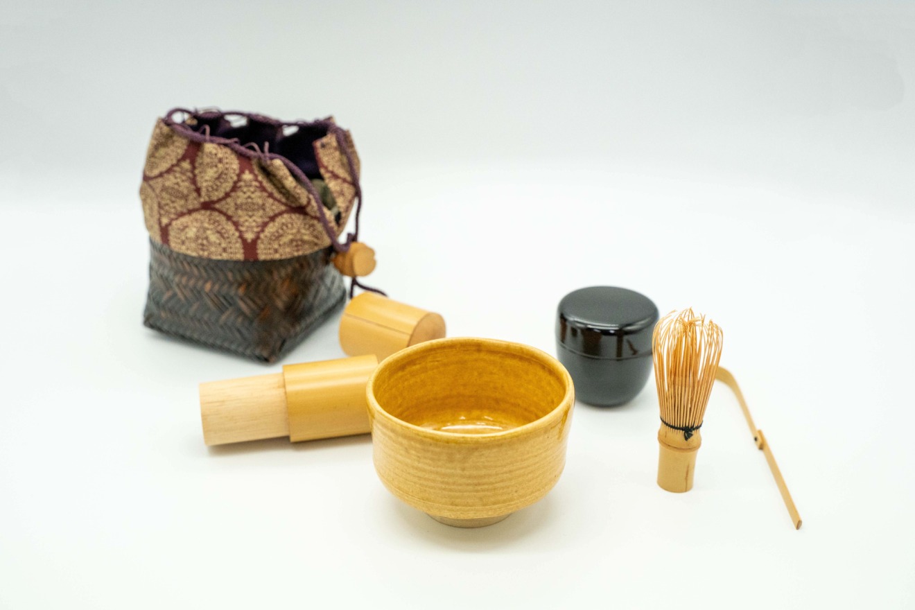 茶碗は黄瀬戸、茶杓・茶筅は竹の筒形の入れ物に納まります。また、小さな棗も入っておりますので、お気に入りの抹茶を入れて
